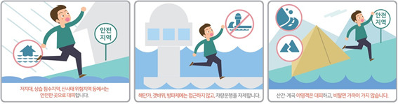 2. 산간·계곡, 하천, 방파제 등 위험지역에 있는 경우 주변 사람들과 함께 안전한 곳으로 이동합니다.